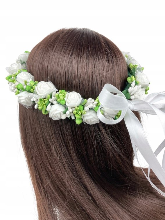 Oferujemy ręcznie robione przez florystkę wianki komunijne. Obwód około 50 cm, regulowane, wiązane wstążką na kokardkę.