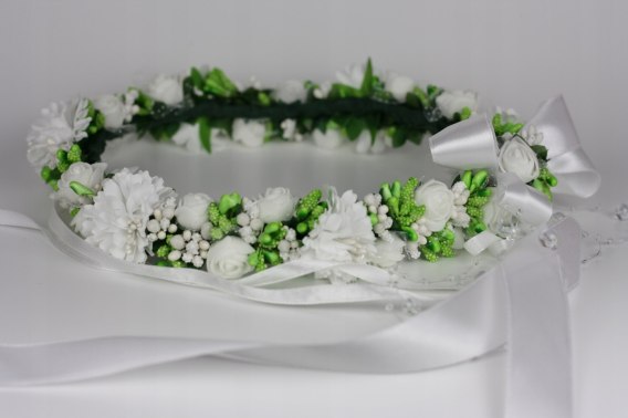 Oferujemy ręcznie robione przez florystkę wianki komunijne. Obwód około 50 cm, regulowane, wiązane wstążką na kokardkę. Ozdobna kokardka mocowana jest na klamerkę.